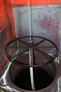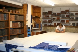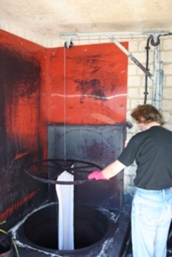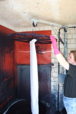 In 7 - 9 Tauchgängen von jeweils 15 Minuten wird der Stoff in der Indigo-Küpe gefärbt. |