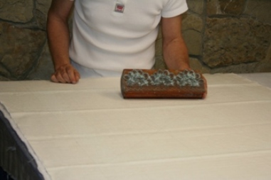 Auf weißem Stoff (Baumwolle, Leinen, Batist) wird mit Modeln der Papp aufgebracht. |